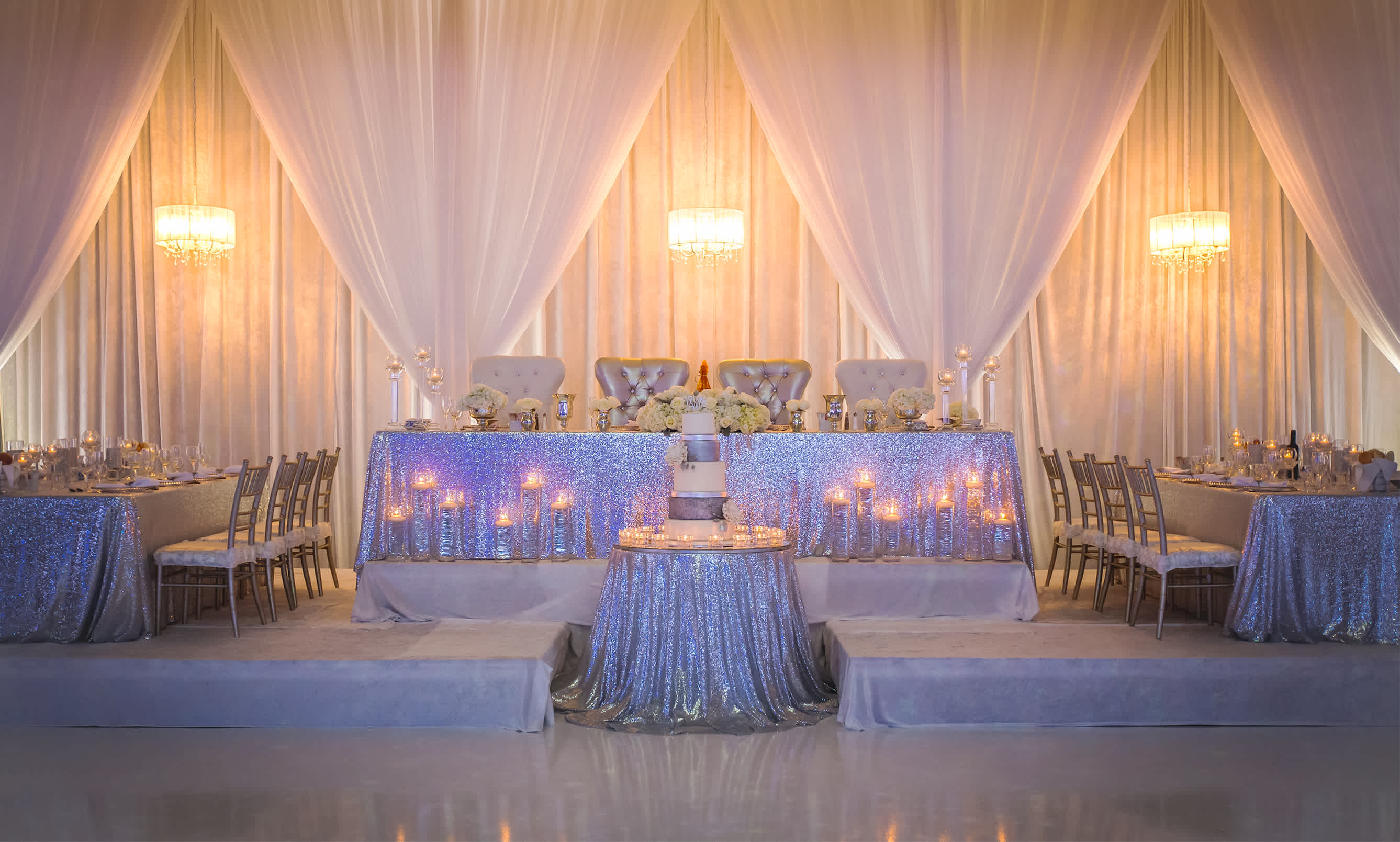 High ceilings, three dazzling chandeliers and ornate fixtures combine to create a spectacular setting for your wedding celebration.